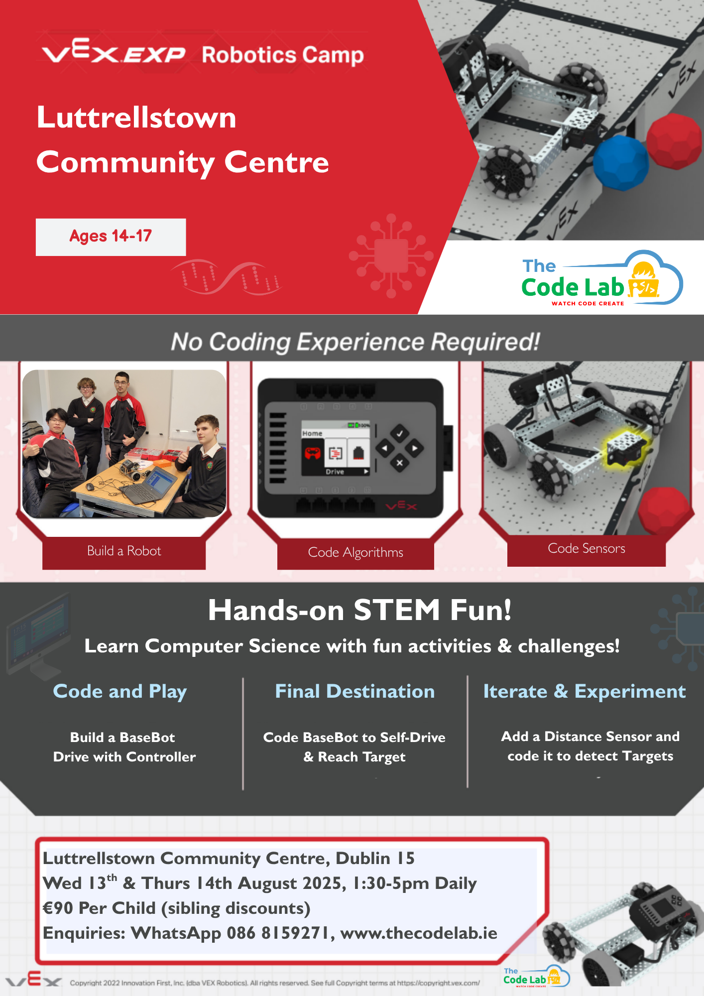 In this action-packed 2-day camp, students will build and code a VEX EXP robot designed to crash through challenges — literally! They build and test their robots, drive them with controllers and learn to code them to self-drive.